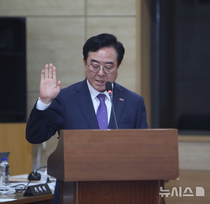 [청주=뉴시스] 서주영 기자 = 고창섭 충북대학교 총장이 18일 충북 청주시 충북대학교에서 열린 국회 교육위원회 국정감사에서 선서하고 있다. 2024.10.18. [email protected]