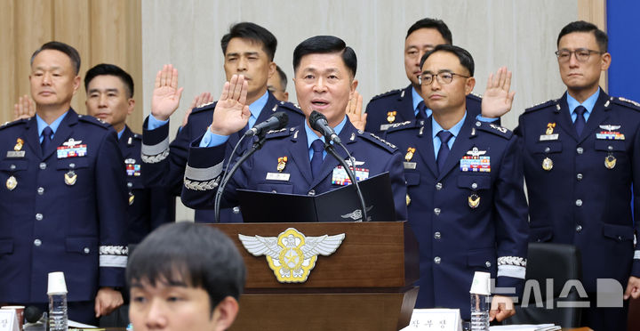 [계룡대=뉴시스] 강종민 기자 = 18일 충남 계룡대에서 열린 국회 국방위원회의 공군본부에 대한 국정감사에서 이영수 공군참모총장이 증인선서를 하고 있다. 2024.10.18. [email protected]