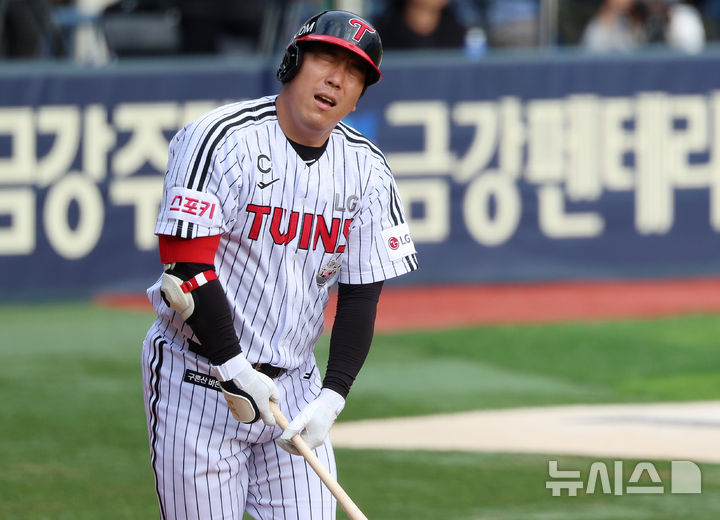 [서울=뉴시스] 이영환 기자 = 19일 서울 송파구 잠실야구장에서 열린 2024 KBO 포스트시즌 플레이오프 4차전 삼성 라이온즈와 LG 트윈스의 경기, 7회말 1사 주자없는 상황에서 LG 김현수가 중견수 플라이를 날린 후 아쉬워 하고 있다. 2024.10.19. [email protected]