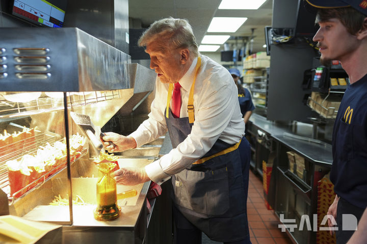 [피스터빌-트레보스=AP/뉴시스] 미국 공화당 대선후보인 도널드 트럼프 전 대통령이 20일(현지시각) 펜실베이니아주 피스터빌-트레버스 소재 맥도날드 메장에서 감자튀김을 만들고 있다. 2024.10.21.