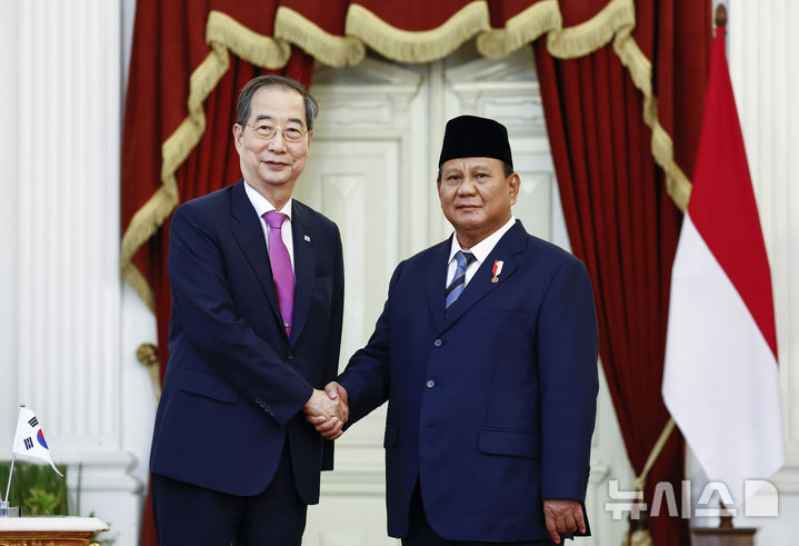 [자카르타=AP/뉴시스] 한덕수(왼쪽) 국무총리가 20일(현지시각) 인도네시아 자카르타의 메르데카궁에서 이날 대통령으로 취임한 프라보워 수비안토 인도네시아 대통령과 악수하고 있다. 한 총리는 수비안토 대통령 취임식에 참석한 후 윤석열 대통령의 친서를 전달하며 양국 관계 발전 방안 등을 논의하며 일정을 소화했다. 2024.10.21.