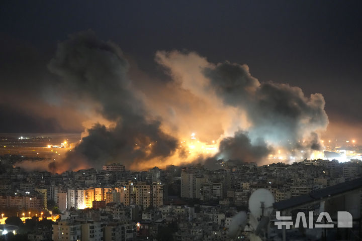 [다히예=AP/뉴시스] 20일(현지시각) 레바논 베이루트 남부 교외 다히예에서 이스라엘의 공습으로 불길과 연기가 치솟고 있다. 레바논 보건부는 이스라엘과 헤즈볼라의 전투가 시작된 이후 이스라엘 공습으로 레바논 사망자가 2464명, 부상자는 1만1530명에 이른다고 발표했다. 2024.10.21.