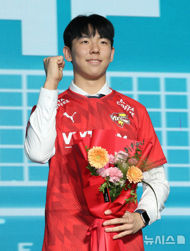 [서울=뉴시스] 고범준 기자 = 21일 서울 강서구 메이필드호텔에서 열린 2024-2025 한국배구연맹(KOVO) 남자 신인선수 드래프트에서 1라운드 3순위 한국전력에 지명된 윤하준이 기념촬영을 하고 있다. 2024.10.21. [email protected]
