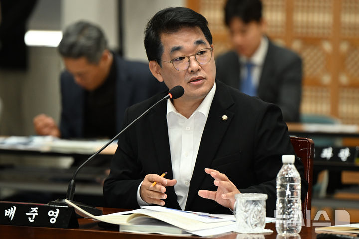 [무안=뉴시스] 박기웅 기자 = 배준영 국민의힘 의원이 21일 오전 전남 무안군 전남도청에서 열린 국회 행정안전위원회 전남도 국정감사에서 질의하고 있다. 2024.10.21. [email protected]