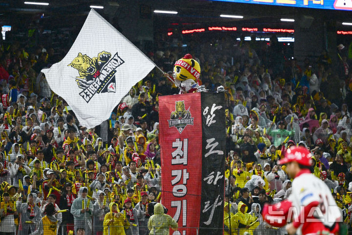 [광주=뉴시스] 이영주 기자 = 21일 광주 북구 광주-기아챔피언스필드에서 열린 2024 KBO 포스트시즌 한국시리즈 1차전 삼성 라이온즈와 KIA 타이거즈의 경기, 2회 초 KIA 마스코트 호걸이와 관중들이 응원하고 있다. 2024.10.21. [email protected]