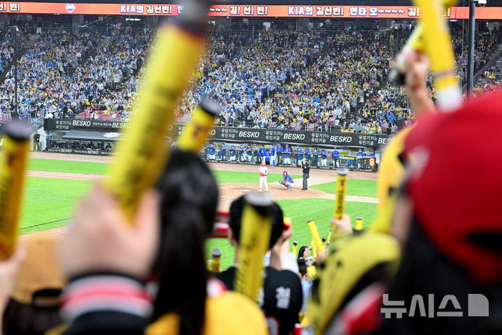 [광주=뉴시스] 김혜인 기자 = 2024 신한 쏠뱅크 KBO 한국시리즈 1차전이 열리는 21일 오후 광주 북구 기아챔피언스필드에서 삼성라이온즈와 KIA타이거즈 팬들의 응원전이 펼쳐지고 있다. 2024.10.21. [email protected]