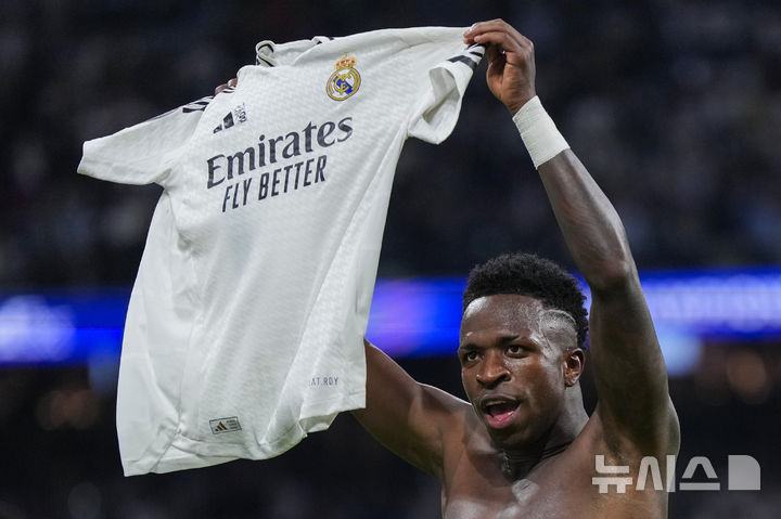 [마드리드=AP/뉴시스] 레알 마드리드(스페인)의 비니시우스 주니오르가 22일(현지시각) 스페인 마드리드의 산티아고 베르나베우에서 열린 2024-25 유럽축구연맹(UEFA) 챔피언스리그(UCL) 리그 페이즈 3차전 보루시아 도르트문트(독일)와 경기 후반 41분 팀의 네 번째 골을 넣은 후 세리머니하고 있다. 비니시우스는 후반 추가 시간에도 골을 추가해 해트트릭을 기록하며 팀의 5-2 역전승을 이끌었다. 2024.10.23.
