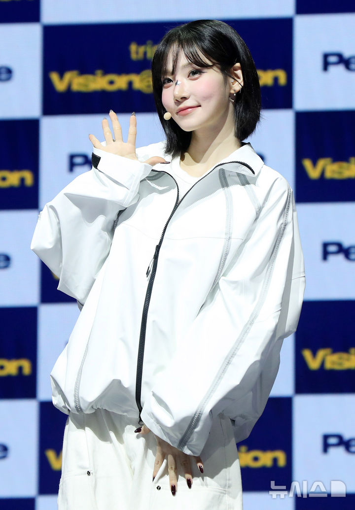 [서울=뉴시스] 김혜진 기자 = 그룹 트리플에스 Vision@ry Vision 나경이 23일 오후 서울 광진구 예스24라이브홀에서 열린 첫 번째 앨범 '퍼포만테(Performante)' 발매 기념 쇼케이스에서 포즈를 취하고 있다.