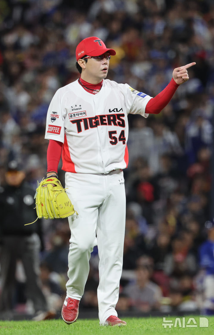 [광주=뉴시스] 김금보 기자 = 23일 광주 북구 광주-기아챔피언스필드에서 열린 2024 KBO 포스트시즌 한국시리즈 2차전 삼성 라이온즈와 KIA 타이거즈의 경기, 4회초 2사 2루 삼성 김헌곤 내야 땅볼 처리로 이닝을 마치고 포수 김태군에게 손짓을 하고 있다. 2024.10.23. [email protected]