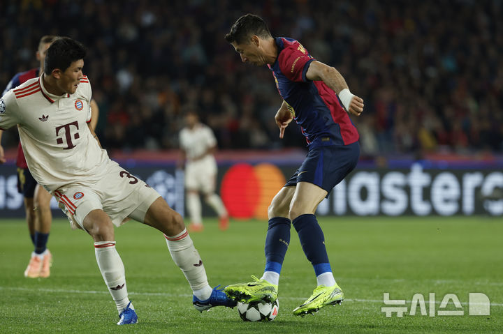 [바르셀로나=AP/뉴시스] 바이에른 뮌헨의 김민재(왼쪽)가 23일(현지시각) 스페인 바르셀로나의 올림픽 스타디움에서 열린 2024-25 유럽축구연맹(UEFA) 챔피언스리그(UCL) 리그 페이즈 3차전 바르셀로나와 경기 중 로베르트 레반도프스키와 공을 다투고 있다. 뮌헨은 이날 하피냐에게 해트트릭을 허용하며 1-4로 패했다. 2024.10.24.