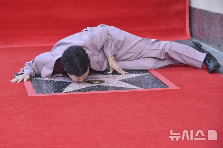 [로스앤젤레스=AP/뉴시스] 한국계 미국 배우이자 코미디언인 켄 정(정강조)이 할리우드 명예의 거리에 헌액돼 23일(현지시각) 미 캘리포니아주 로스앤젤레스 명예의 거리에서 본인 이름이 새겨진 별 판에 입 맞추고 있다. 그는 “말로 표현할 수 없을 만큼 영광스럽다”라고 소감을 밝혔다. 2024.10.24.