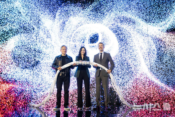 [카스트럽=AP/뉴시스] 프레데릭 10세(오른쪽) 덴마크 국왕이 23일(현지시각) 덴마크 카스트럽의 빌헬름 로리첸 터미널에서 젠슨 황(왼쪽) 엔비디아 최고경영자(CEO), 나디아 칼스텐 덴마크 인공지능(AI) 혁신 센터장과 함께 슈퍼컴퓨터 '게피온'을 가동하고 있다. '게피온'은 1528개의 그래픽 처리 장치(GPU)를 갖춘 슈퍼컴퓨터로 덴마크 제약, 생명공학, 녹색 전환, 양자 컴퓨팅 분야 연구자들을 위한 것으로 알려져 있다. 2024.10.24.