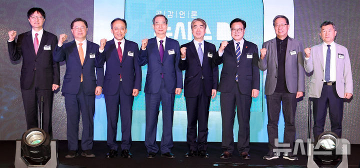 왼쪽부터 김흥종 고려대 교수, 박일준 대한상의 상근부회장, 추경호 국민의힘 원내대표, 한덕수 국무총리, 염영남 뉴시스 대표이사, 우원식 국회의장, 전하진 SDX재단이사장, 정석 서울시립대 도시공학과 교수. 2024.10.24. [email protected]