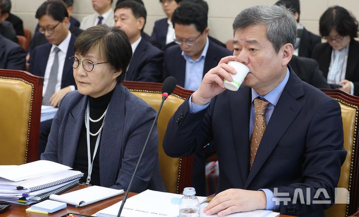 [서울=뉴시스] 조성봉 기자 = 박민 한국방송공사 사장이 24일 오전 서울 여의도 국회 과학기술정보방송통신위원회에서 열린 방송통신위원회 등에 대한 종합 국정감사에서 물을 마시고 있다. 2024.10.24. [email protected]