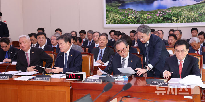 [서울=뉴시스] 권창회 기자 = 24일 오전 서울 여의도 국회에서 열린 외교통일위원회의 외교부, 통일부, 민주평화통일자문회의사무처, 재외동포청 등에 대한 종합감사에서 국무위원들이 자료를 살펴보고 있다. 사진 왼쪽부터 이상덕 재외동포청장, 김영호 통일부 장관, 조태열 외교부 장관, 태영호 민주평통 사무처장. 2024.10.24. [email protected]