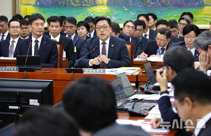 [서울=뉴시스] 조성우 기자 = 김병환(가운데) 금융위원장이 24일 오후 서울 여의도 국회에서 열린 정무위원회의 금융위원회, 금융감독원에 대한 종합감사에서 의원 질문에 답변하고 있다. 2024.10.24. [email protected]