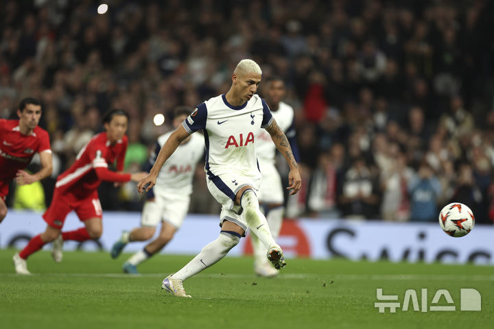 [런던=AP/뉴시스] 토트넘 홋스퍼의 히샤를리송이 24일(현지시각) 영국 런던의 토트넘 홋스퍼 스타디움에서 열린 2024-25 유럽축구연맹(UEFA) 유로파리그(UEL) 리그 페이즈 3차전 AZ 알크마르(네덜란드)와 경기 후반 8분 페널티킥으로 선제골을 넣고 있다. 손흥민이 빠진 토트넘이 1-0으로 이기고 UEL 3연승을 기록했다. 2024.10.25.
