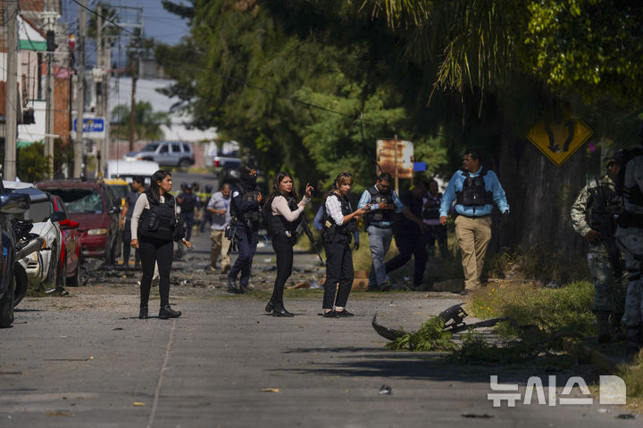 [아캄바로=AP/뉴시스] 24일(현지시각) 멕시코 과나후아토주 아캄바로의 경찰서 인근에서 차량 폭탄이 폭발해 폭탄 전문가와 경찰관들이 현장을 조사하고 있다. 현지 경찰은 이 폭발로 경찰관 3명이 다치고 인근 건물과 차량이 파손됐다고 밝혔다. 2024.10.25.