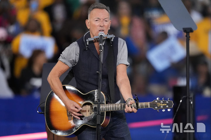 [클라크스턴=AP/뉴시스] 미국 록 전설 브루스 스프링스틴이 24일(현지시각) 조지아주 클라크스턴에서 민주당 대선 후보 카멀라 해리스 부통령을 지지하는 공연을 펼치고 있다. 2024.10.25.