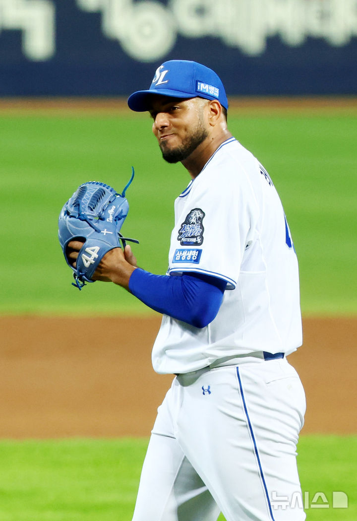 [대구=뉴시스] 전신 기자 = 25일 대구 수성구 대구삼성라이온즈파크에서 열린 2024 KBO 포스트시즌 한국시리즈 3차전 KIA 타이거즈와 삼성 라이온즈의 경기에서 5회초 2사 1, 2루 삼성 선발 레예스가 KIA 최원준을 좌익수 라이드라이브 아웃 시킨 뒤 기뻐하고 있다. 2024.10.25. [email protected]
