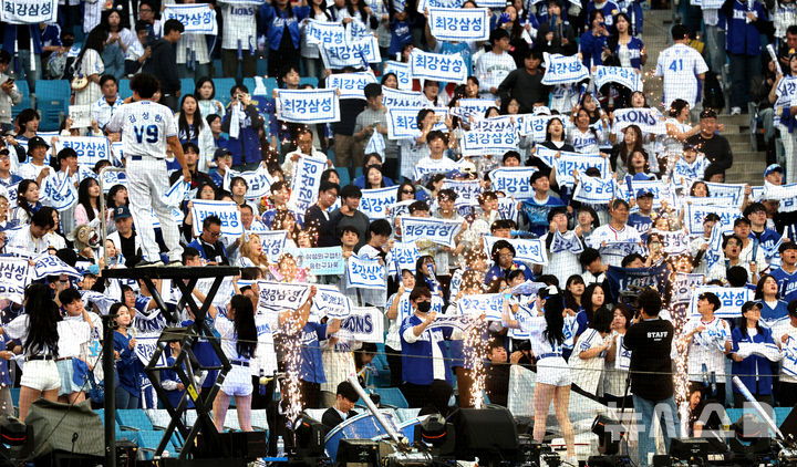[대구=뉴시스] 이무열 기자 = 26일 대구 수성구 대구삼성라이온즈파크에서 열린 2024 KBO 포스트시즌 한국시리즈 4차전 KIA 타이거즈와 삼성 라이온즈의 경기, 삼성 팬들이 열띤 응원전을 펼치고 있다. 2024.10.26. [email protected]