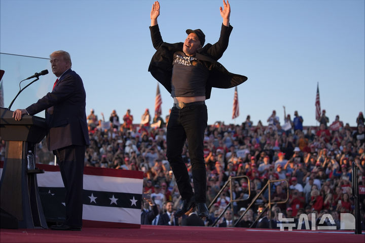 [버틀러(미 펜실베이니아주)=AP/뉴시스]일론 머스크 테슬라 및 스페이스X 최고경영자(CEO)가 지난 5일 미 펜실베이니앚 버틀러에서 열린 도널드 트럼프 미 공화당 대선 후보의 선거유세에 참석 연설하는 트럼프 전 대통령 옆에서 점프하고 있다. 조 바이든 미 대통령은 26일(현지시각) 머스크가 세계 최고의 부자 중 한 사람이 되기 전 '불법 노동자'로서 미국에서 오랜 경력을 시작했며 이민 문제에 대한 그의 주장은 위선이라고 비난했다고 CNBC가 27일 보도했다. 2024.10.27.