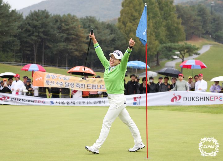 [서울=뉴시스] 황준선 기자 = 27일 경기 용인시 88CC에서 열린 '덕신EPC 서울경제 레이디스 클래식' 파이널 라운드 우승자 지한솔이 우승을 확정지으며 환호하고 있다. (사진 = KLPGT 제공) 2024.10.27. [email protected] *재판매 및 DB 금지