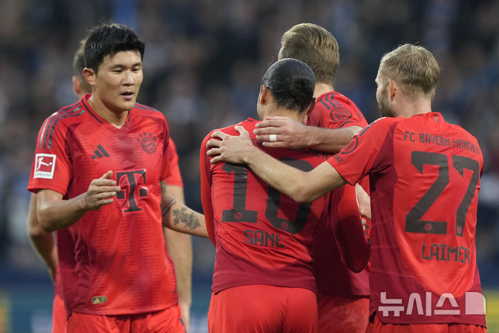 [보훔=AP/뉴시스] 바이에른 뮌헨의 김민재(왼쪽)가 27일(현지시각) 독일 보훔의 보노비아 루르슈타디온에서 열린 2024-25 분데스리가 8라운드에서 보훔과의 경기 후반 20분 레로이 자네(10)의 팀 네 번째 골을 축하하고 있다. 김민재는 78분을 소화했고 뮌헨은 5-0으로 대승했다. 2024.10.28.