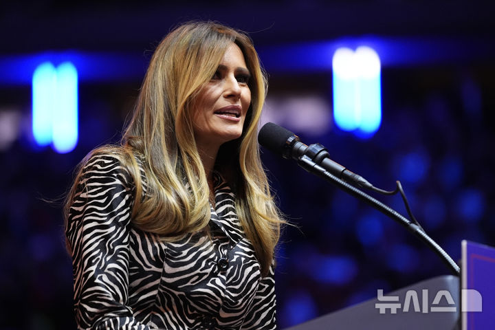 [뉴욕=AP/뉴시스] 멜라니아 트럼프 여사가 27일(현지시각) 미국 뉴욕의 매디슨 스퀘어 가든에서 열린 공화당 대선 후보 도널드 트럼프 전 대통령의 유세에 참석해 남편을 소개하고 있다. 멜라니아 여사는 "뉴욕시와 미국은 마법을 되찾아야 한다"라며 트럼프를 소개했다.2024.10.28.
