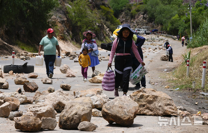 [코차밤바=AP/뉴시스] 27일(현지시각) 볼리비아 코차밤바 인근에서 에보 모랄레스 전 대통령 지지자들이 돌과 장애물로 도로를 막고 있다. 이들은 아동 학대 혐의를 받는 모랄레스 전 대통령이 형사 조사를 받지 못하게 방해하면서 이날 발생한 암살 시도에 항의하고 있다. 모랄레스는 앞서 차량 이동 중 무장 괴한들의 총격을 받아 그의 운전자가 부상한 것과 관련해 총격의 배후가 루이스 아르세 현 대통령이라고 주장했다. 2024.10.28.