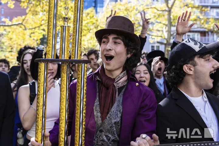 [뉴욕=AP/뉴시스] 27일(현지시각) 미국 뉴욕 워싱턴 스퀘어 파크에서 배우 티모테 샬라메 닮은꼴 대회가 열려 우승자인 마일스 미첼(21)이 우승컵을 들고 환호하고 있다. 이날 대회 참가자들은 영화 '웡카'의 윌리 웡카, '듄'의 폴 아트레이데스 등 티모테가 영화에서 맡았던 역할로 분장했다. 우승자인 미첼은 트로피와 상금 50달러(약 7만 원)를 받았다. 2024.10.28.