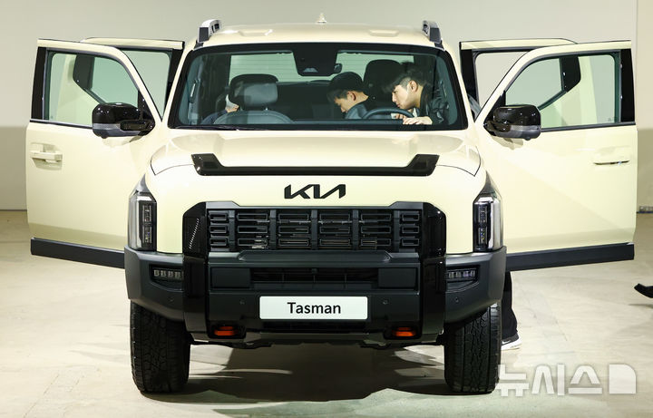 [서울=뉴시스] 황준선 기자 = 지난 28일 서울 송파구 호텔 파크하비오에서 열린 더 기아 타스만 미디어 프리뷰에서 기아가 출시하는 첫 픽업트럭인 '타스만'이 공개되고 있다. 2024.10.29. [email protected]