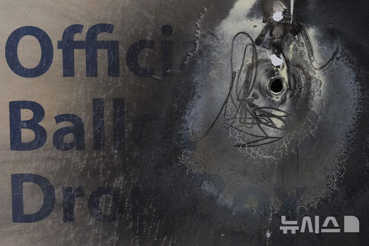 [포틀랜드=AP/뉴시스] 28일(현지시각) 미 오리건주 포틀랜드의 멀트노마 카운티 선거 관리 사무소에서 화재로 손상된 투표함을 놓고 기자회견하고 있다. 미국 대선을 약 일주일 남겨둔 시점에 일부 지역 투표함에서 잇따라 화재가 발생해 경찰이 방화에 무게를 두고 조사하고 있다. 2024.10.29.