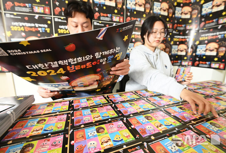 [수원=뉴시스] 김종택기자 = 29일 경기도 수원시 팔달구 대한결핵협회 경기도지부에서 관계자들이 '2024 크리스마스 씰'을 살펴보고 있다.