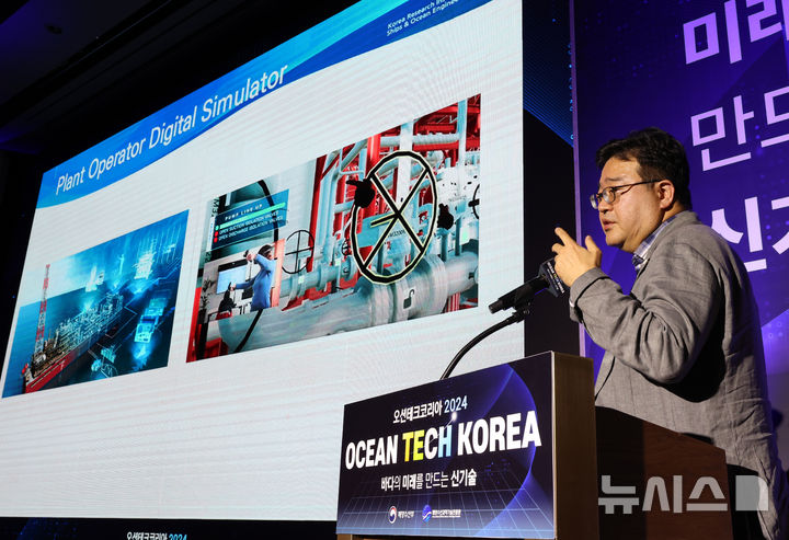 [서울=뉴시스] 이영환 기자 = 김기훈 선박해양플랜트연구소 박사가 29일 서울 서초구 엘타워 오르체홀에서 열린 오션테크코리아 2024에서 '글로벌 해양 에너지 개발 회사의 DX'를 주제로 발표하고 있다. 2024.10.29. [email protected]