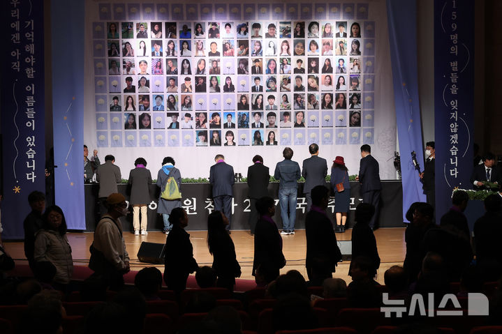 [서울=뉴시스] 권창회 기자 = 29일 오전 서울 여의도 국회에서 열린 10·29 이태원참사 2주기 추모식에서 유가족 등이 희생자의 영정에 헌화하고 있다.(공동취재) 2024.10. 29. [email protected]