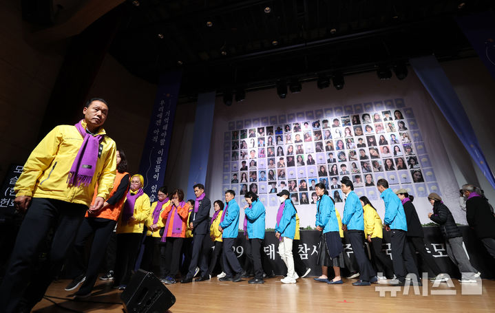 [서울=뉴시스] 권창회 기자 = 29일 오전 서울 여의도 국회에서 열린 10·29 이태원참사 2주기 추모식에서 세월호 유가족 등 참석자들이 희생자들의 영정에 헌화하고 있다.(공동취재) 2024.10. 29. [email protected]