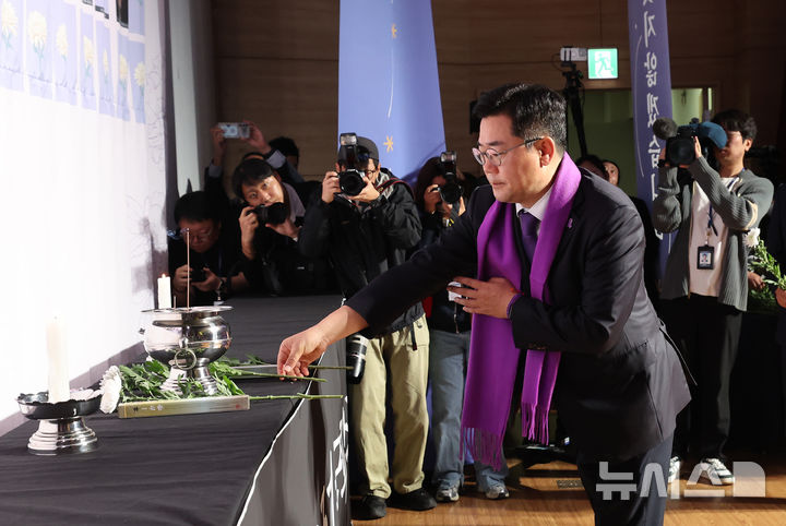 [서울=뉴시스] 권창회 기자 = 박찬대 더불어민주당 원내대표가 29일 국회에서 열린 10·29 이태원참사 2주기 추모식에서 헌화를 하고 있다.(공동취재) 2024.10.29. [email protected]
