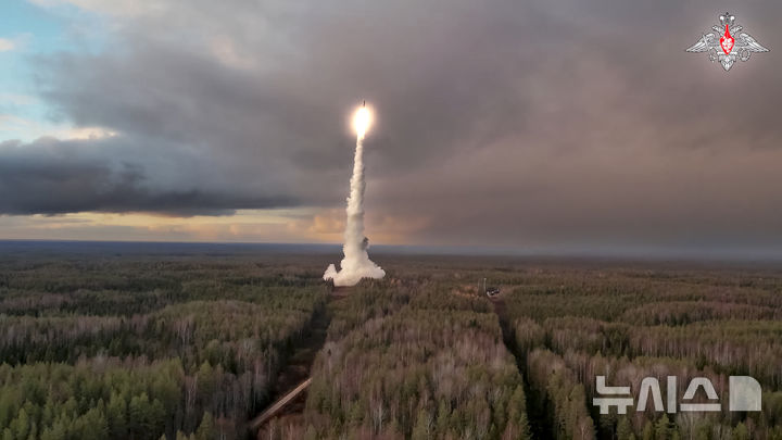 [플레세츠크=AP/뉴시스] 러시아 국방부가 공개한 영상 사진에 29일(현지시각) 러시아 북서부 플레세츠크 발사장에서 캄차카반도를 향해 야르스 대륙간탄도미사일(ICBM)이 시험 발사되고 있다. 러시아는 상대의 핵 공격 상황에 대비해 ICBM 시험 발사 등 대규모 핵 공격 훈련을 했다. 2024.10.30.