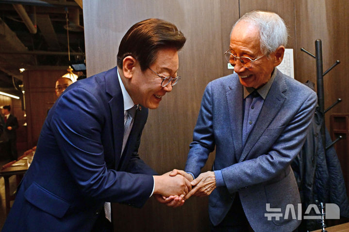 [서울=뉴시스] 권창회 기자 = 이재명 더불어민주당 대표가 30일 오전 서울 여의도 한 식당에서 윤여준 전 환경부 장관과 오찬 회동에 나서며 인사하고 있다. (공동취재) 2024.10.30. [email protected]