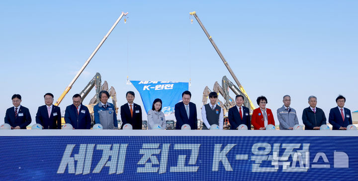 왼쪽부터 유국희 원자력안전위원장, 손병복 경북 울진군수, 황주호 한국수력원자력(한수원) 사장, 강성현 영진테크윈 대표, 안덕근 산업통상자원부 장관, 이채림 현대건설 매니저, 윤 대통령, 김현우 한국원자력마이스터고 학생, 이철규 국회 산업통상자원중소벤처기업위원장, 황영분 지역주민대표, 박지원 두산에너빌리티 회장, 김동철 한국전력 사장, 박형수 국민의힘 의원. (대통령실통신사진기자단) 2024.10.30. [email protected]