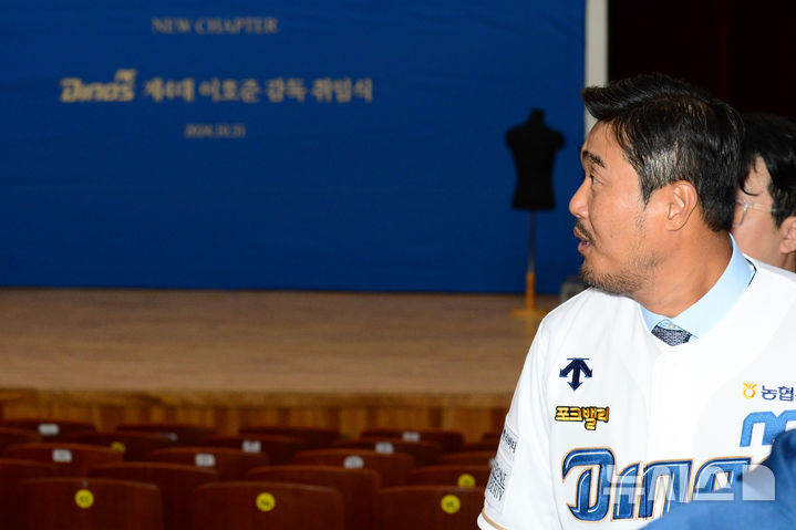 [창원=뉴시스] 차용현 기자 = 31일 오후 경남 창원시 마산종합운동장 올림픽기념관공연장에서 NC 다이노스 제 4대 이호준 감독이 취임식을 갖고 새 사령탑에 올랐다. 사진은 이날 취임한 이호준 감독이 취임식을 마치고 퇴장하고 있다. [email protected]
