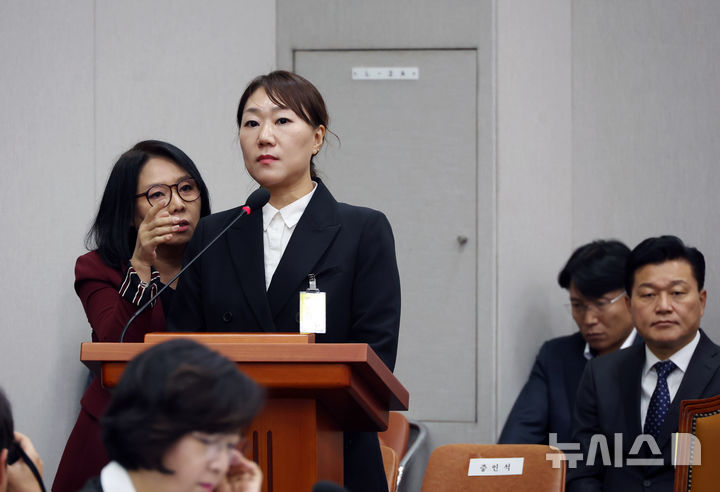 [서울=뉴시스] 고승민 기자 = 김영선 전 의원의 회계 책임자이자 김건희 여사의 공천개입 의혹을 제기한 강혜경 씨가 1일 서울 여의도 국회에서 열린 운영위원회의 대통령비서실, 국가안보실, 대통령경호처 국정감사에서 의원 질의를 들으며 노영희 변호사의 말을 듣고 있다. 2024.11.01. [email protected]