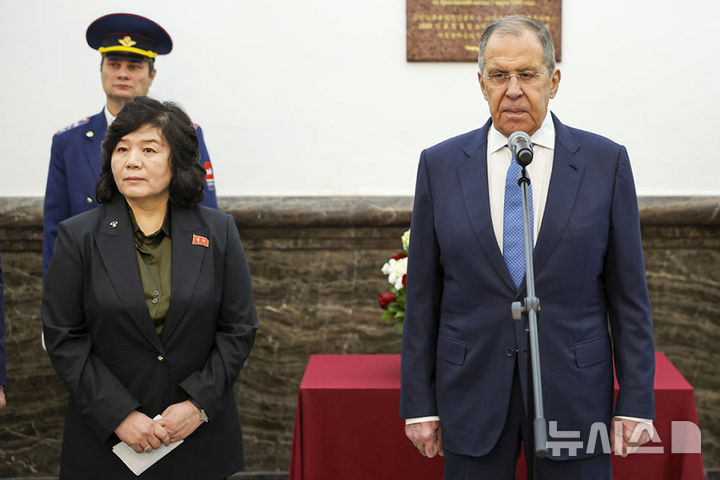 [모스크바=AP/뉴시스] 러시아 외무부가 1일(현지시각) 공개한 사진에 세르게이 라브로프(오른쪽) 러시아 외무장관과 최선희 북한 외무상이 모스크바 야로슬라브스키역에서 김일성 주석의 1949년 소련 방문을 기념하는 명판 제막식에 참석하고 있다. 2024.11.02.