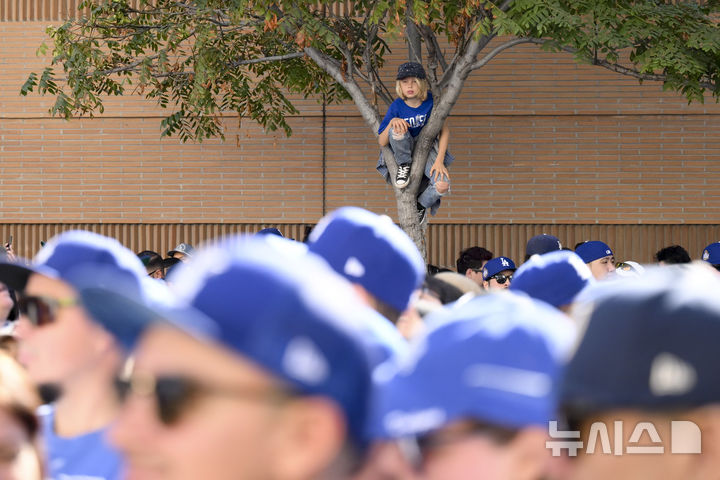 [로스앤젤레스=AP/뉴시스] 1일(현지시각) 미 캘리포니아주 로스앤젤레스에서 LA 다저스의 2024 월드시리즈(WS) 우승 기념 퍼레이드가 열린 가운데 한 어린이 팬이 나무에 올라가 다저스 선수단의 행진을 지켜보고 있다. 다저스는 WS에서 뉴욕 양키스에 4승1패를 거두고 통산 8번째 정상에 올랐다 2024.11.02.