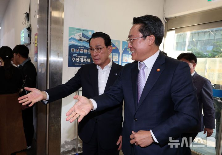 [서울=뉴시스] 김선웅 기자 = 노동진 수산업협동조합중앙회(수협) 회장과 강도형 해양수산부 장관이 2일 서울 동작구 노량진수산시장에서 수산대축제 참석 전 수산시장을 점검하고 있다. 2024.11.02. [email protected]