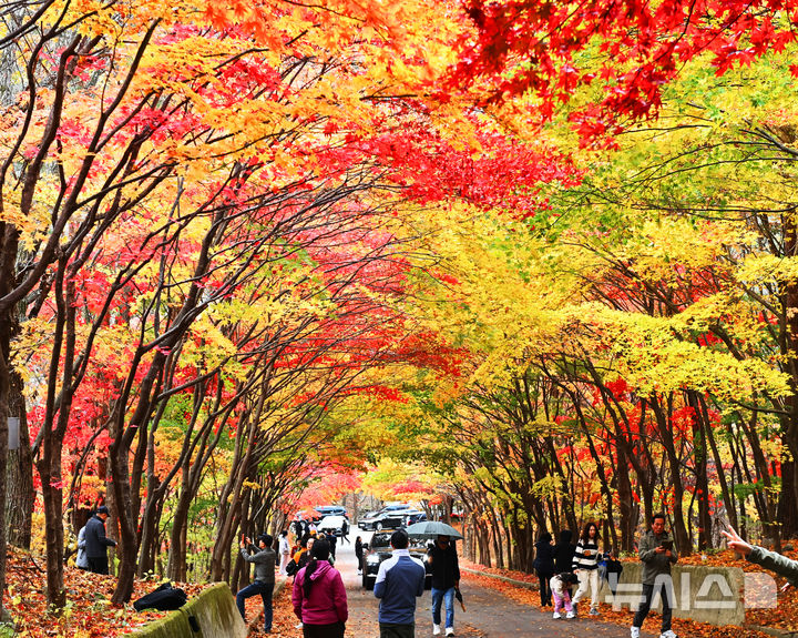 [인제=뉴시스] 김종택기자 = 2일 강원도 인제군 인제읍 필레약수터를 찾은 나들이객들이 울긋불긋 빛깔로 물든 단풍길을 걸으며 가을 정취를 만끽하고 있다. 2024.11.02. [email protected]