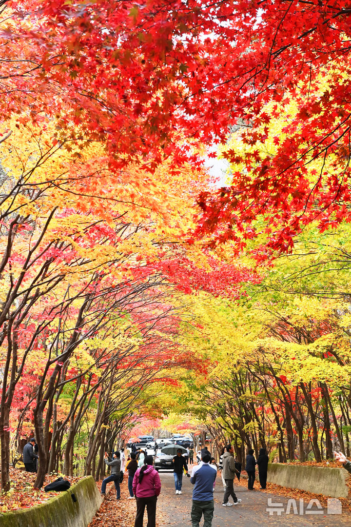 [인제=뉴시스] 김종택기자 = 2일 강원도 인제군 인제읍 필레약수터를 찾은 나들이객들이 울긋불긋 빛깔로 물든 단풍길을 걸으며 가을 정취를 만끽하고 있다. 2024.11.02. [email protected]