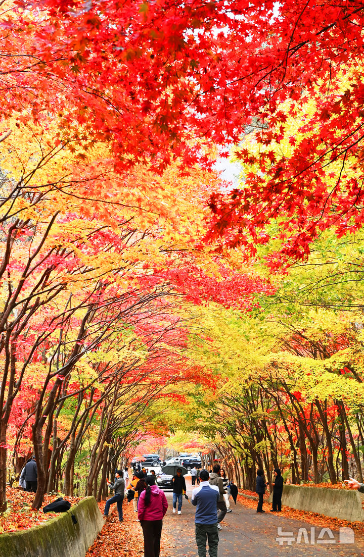 [인제=뉴시스] 김종택기자 = 2일 강원도 인제군 인제읍 필레약수터를 찾은 나들이객들이 울긋불긋 빛깔로 물든 단풍길을 걸으며 가을 정취를 만끽하고 있다. 2024.11.02. [email protected]