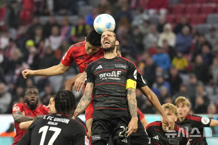[뮌헨=AP/뉴시스] 바이에른 뮌헨의 김민재(가운데)가 2일(현지시각) 독일 뮌헨의 알리안츠 아레나에서 열린 2024-25시즌 독일 분데스리가 9라운드 우니온 베를린과 경기 중 공중 볼을 다투고 있다. 김민재는 69분을 소화하며 팀의 3-0 완승에 기여했다. 2024.11.03.